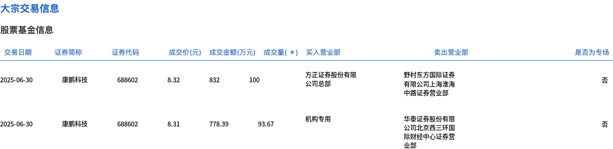 6月30日,康鹏科技大宗交易成交193.67万股,成交额1610.39万元,占当日总成交额的17.23%,成交均价8.32元,较市场收盘价8.38元折价0.77%,其中最高成交价8.32元,最低成交价8.31元。