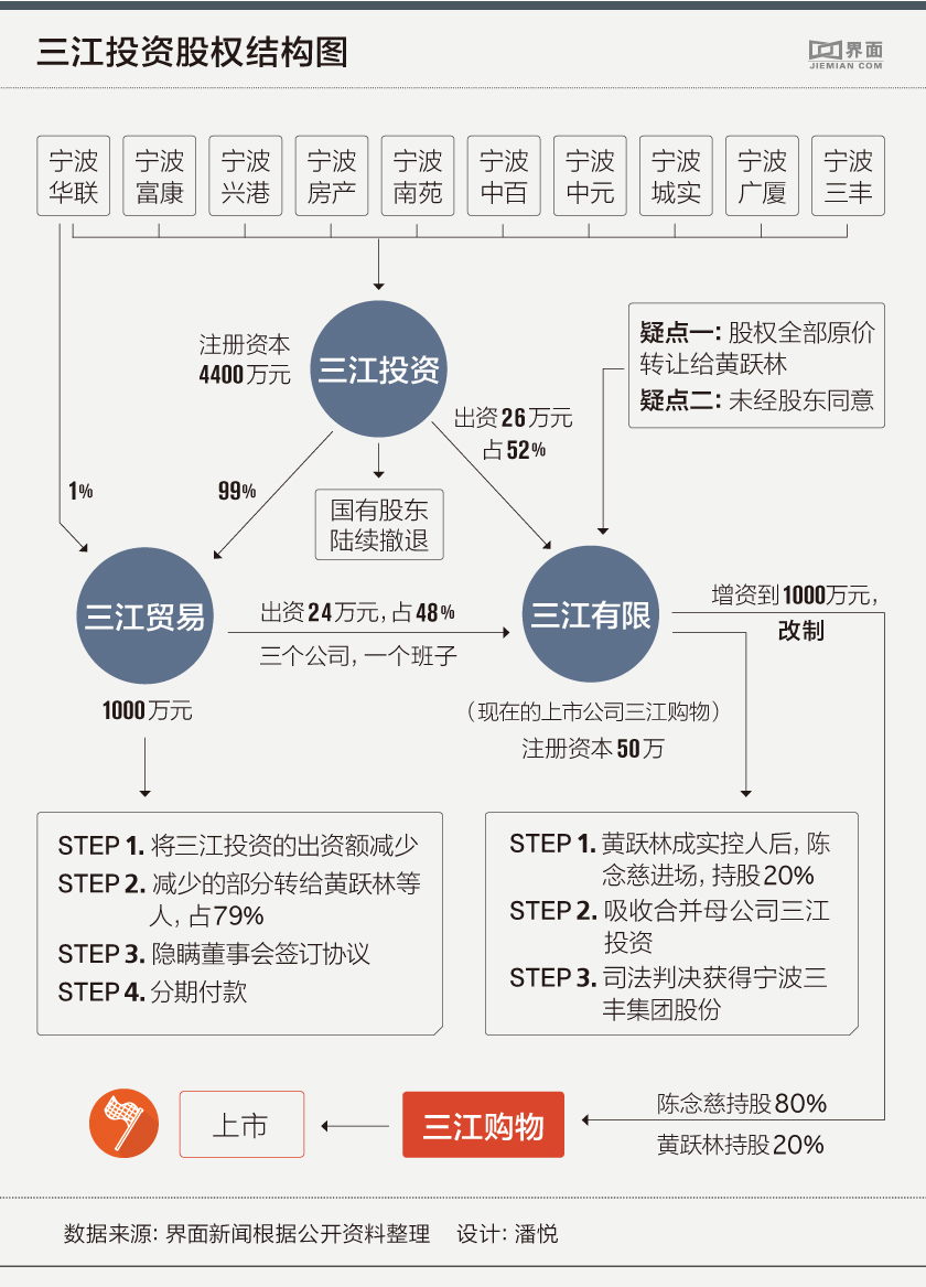 据三江购物招股说明书资料显示,从2002年11月起两年多时间内,黄跃林代表三江贸易与陈念慈通过3次《股权转让协议》,将其控制的三江贸易名下的三江有限股权悉数倒给陈念慈。到2004年底,三江有限仍为出资1000万元,但股权就变成了陈念慈占80%,黄跃林占20%。其后陈念慈将其持有的股份转到由他本人和亲属控制的上海和安投资管理有限公司(下称上海和安)。