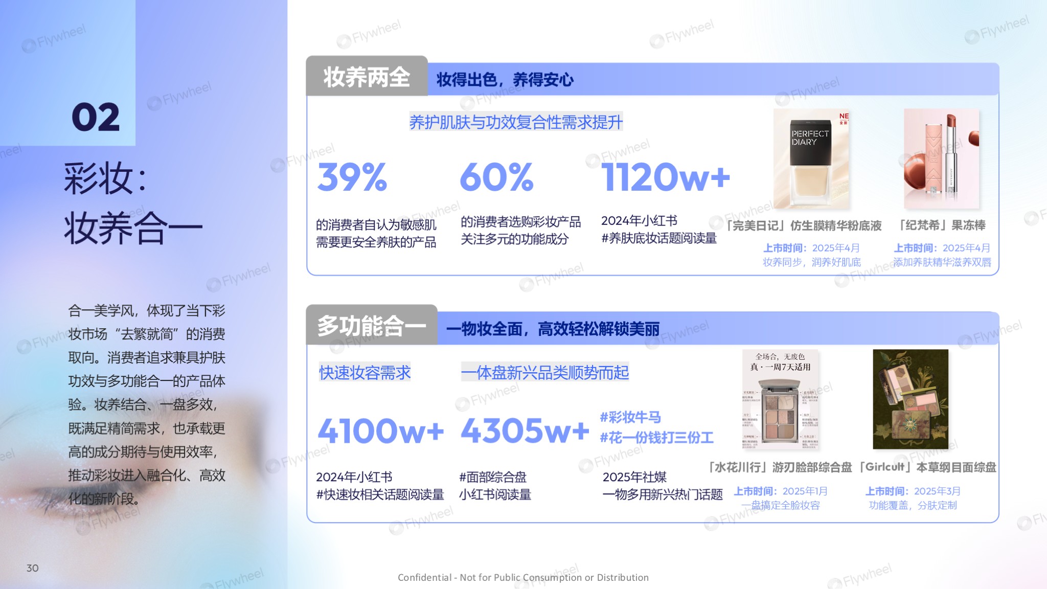 彩妆品类践行妆养合一,重塑体验。融合彩妆修饰与护肤养肤功效的多功能产品逐渐成为主流,“妆养两全”、“一盘多效”模式不仅满足精简需求,更承载着消费者对成分安全性和使用效率的更高期待,标志着彩妆迈入融合化、高效化的新阶段。