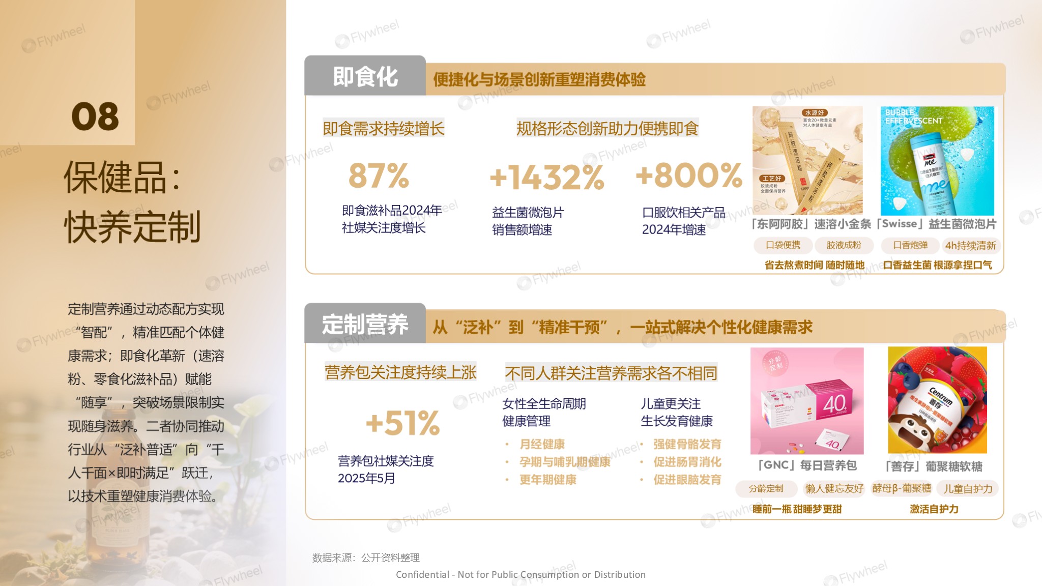 保健品转型快养定制,个性跃迁。定制营养通过动态配方实现“智配”,精准匹配个体需求;即食化形态(速溶粉、零食化滋补)实现“随享”,突破场景限制。二者协同推动行业从“泛补普适”向“千人千面 × 即时满足”跃迁,以技术赋能精准、便捷的健康管理。