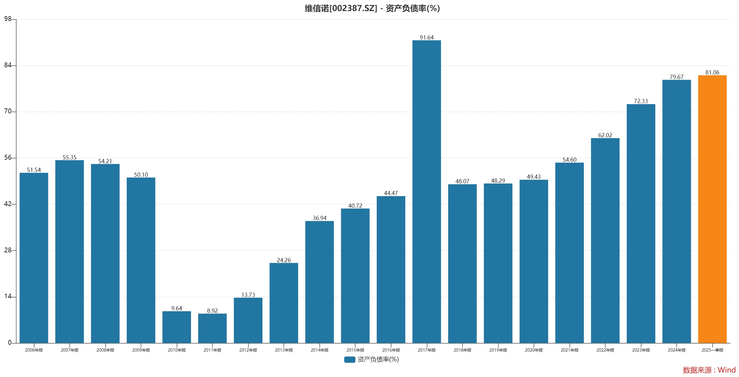 近年来,维信诺的资产负债率持续抬升。今年一季度末,该数据为81.06%,为近20年次高。
