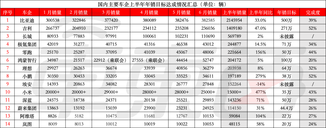 从年销目标的角度来看,今年上半年,年销量目标达成度最低的大多是新势力车企。
