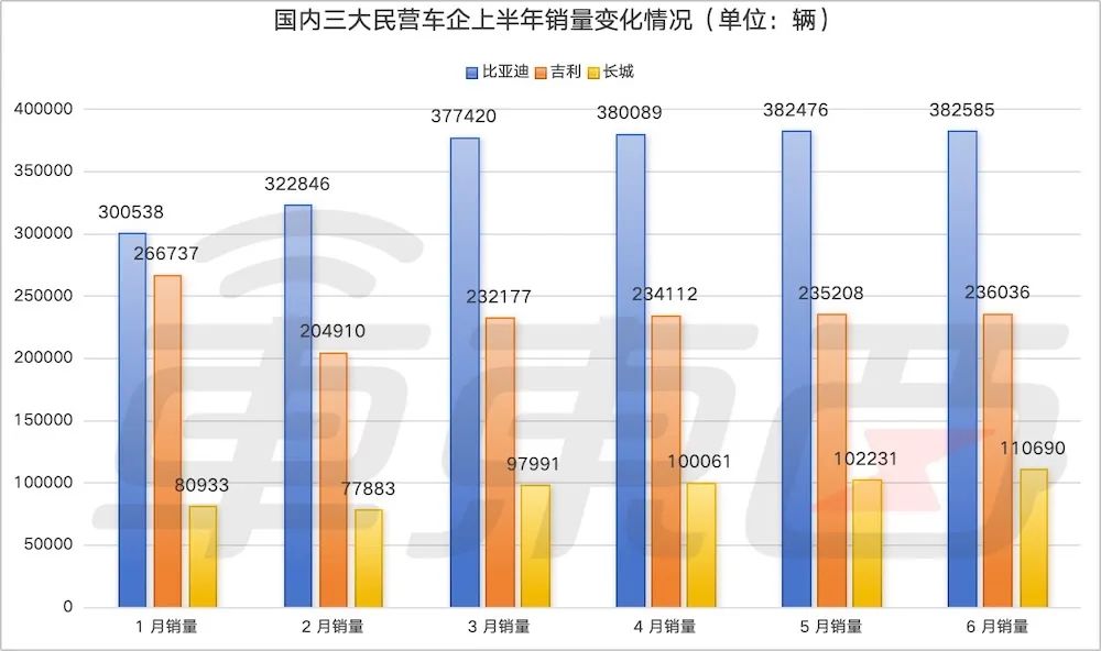 民营造车三强中,比亚迪、长城两家传统车企新能源销量同环比均增长,比亚迪6月卖车38万台领跑,长城新能源销量达到3.6万台,吉利6月新能源车型卖出12万台,同比增速超过8成,环比下滑11%。