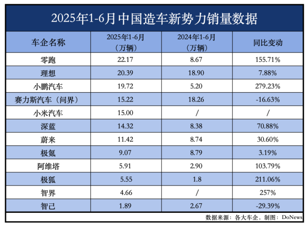 DoNews注意到,2025年上半年,造车新势力最大的变化是:头部阵营的座次在悄然发生变化。