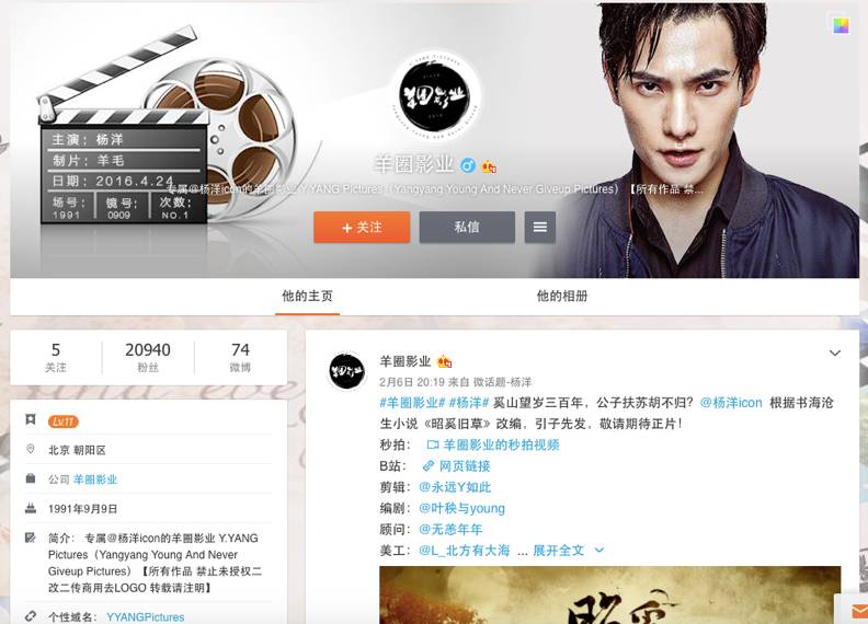 这三个组织成立最早的是羊圈影业,成立于2016年4月24日,而专门制作刘诗诗饭制视频的狮迷影业,成立于2016年7月18日,刘亦菲粉丝的东茜映画成立于2016年9月3日。从时间顺序上来说,杨洋粉丝的羊圈影业算是开了先河。