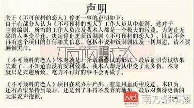 最终,今年3月,该剧制作者通过视频发布声明称:“由于有部分人认为《不可预料的恋人》工作人员从中获利,这对于主创编剧、所有的工作人员以及我本人都是一个极大的污蔑。为防止无辜的人再受牵连,决定停止更新饭制剧《不可预料的恋人》。”