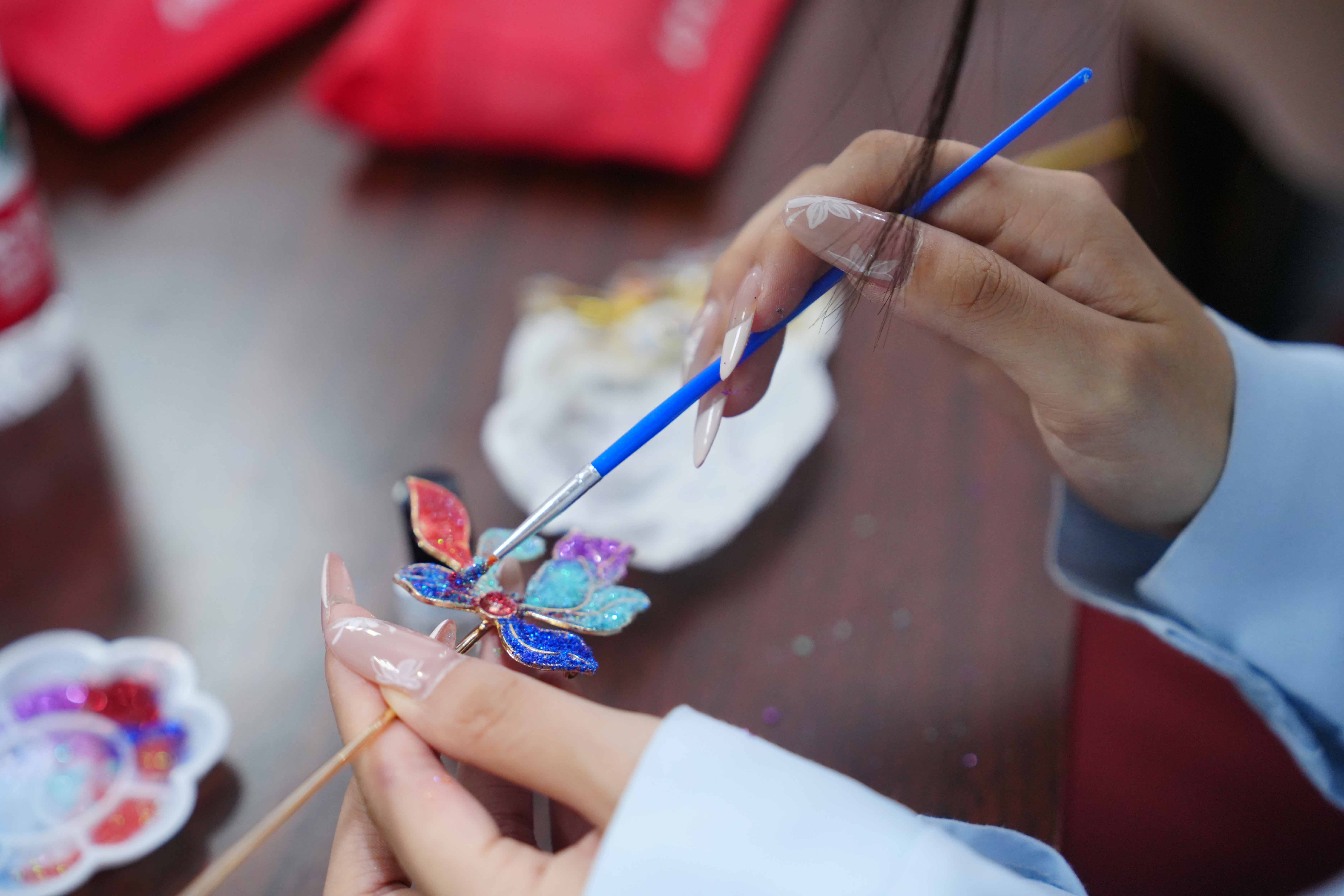 在大学生们的手把手协助下,居民们也亲自上手尝试花丝镶嵌的基础工艺,老年人们小心翼翼地将纤细的金银丝缠绕、编织,并耐心地上色,虽动作略显生疏,但都特别感兴趣。经过1个多小时的努力,他们也在其他大学生的指导帮助下做出了简易花丝戒指、发簪,并纷纷戴上展示拍照。