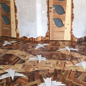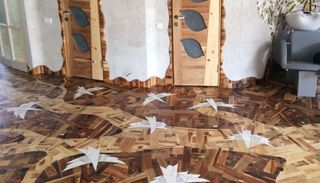 我是Alexey Steshak,一个疯狂的装饰家,喜欢用自己的双手创造令人惊叹的项目。今天,我将向大家展示一个全新的作品——陶瓷鸟与硬木地板,这是为一家美容沙龙设计的。我想做这么一个地板很多年了,我的梦想终于得以实现。整体面积为56平方米,一周工作七天的情况下,我花了五个月才完成。工程开始于2016年10月22日,最终在2017年3月22日完成。还不包括准备材料和干燥的时间。我用到的木材,来自被风吹倒的树、一些果园采摘后砍下的树枝,还有一些朋友们带来的木材。最后,我收获了40包小木板。于是,我就有了这些不同种类的木材:橡木、胡桃楸、杏树、苹果树、梨树、灰树、桦树、白蜡树、美国核桃、樱桃树、落叶松、花楸和一些小红木。