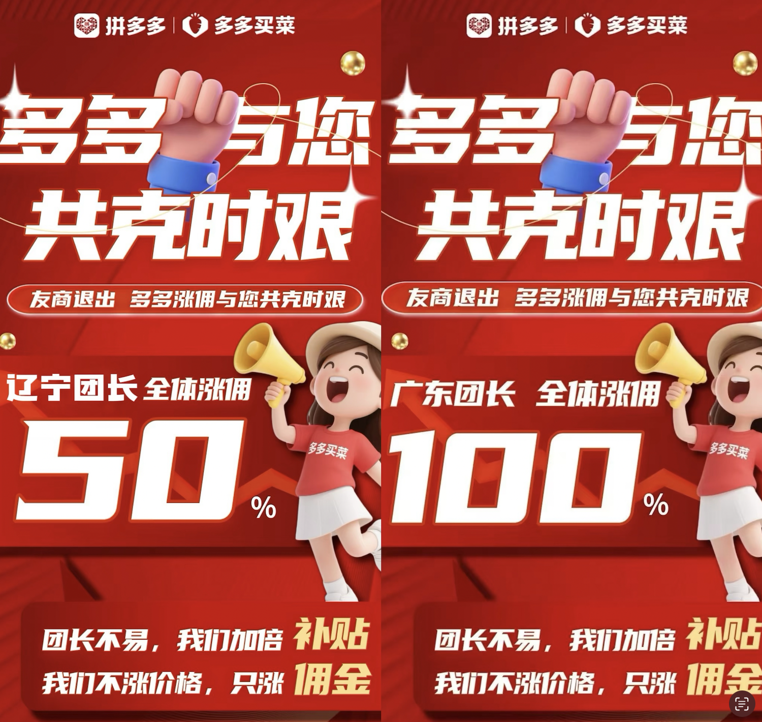 除了供应商,网格仓、物流运力、团长也是多多买菜同步的拉拢对象。界面新闻看到当前在江苏、重庆、辽宁等部分地区,多多买菜提高了团长整体佣金至50%,在美团优势区域的广东地区,佣金涨幅甚至达到100%,以吸引美团团长加盟。