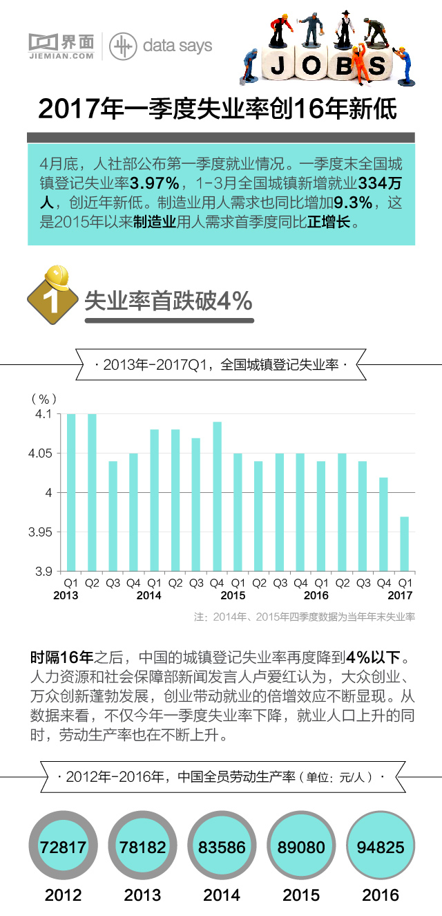 4月底,人社部公布第一季度就业情况。一季度末全国城镇登记失业率3.97%,1-3月全国城镇新增就业334万人,创近年新低。制造业用人需求同比增加9.3%,这是2015年以来制造业用人需求首季度同比正增长。