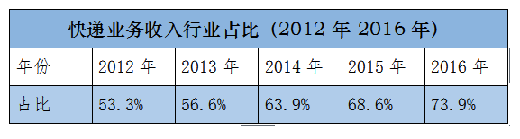 2016年同城、异地、国际/港澳台快递业务量占全部比例分别为23.7%、74.3%和2%,业务收入占全部比例分别为14.2%、52.8%和10.8%。
