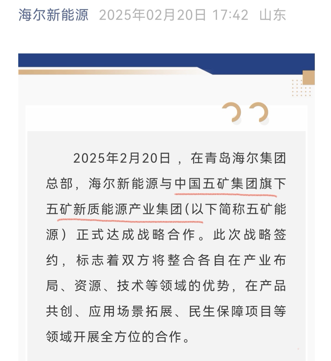 今年2月20日,海尔新能源官方公众号发布消息称,在青岛海尔集团总部,海尔新能源与中国五矿集团旗下五矿新质能源产业集团正式达成战略合作。文章称,五矿新质能源产业集团董事长梁红军参与了此次签署仪式。