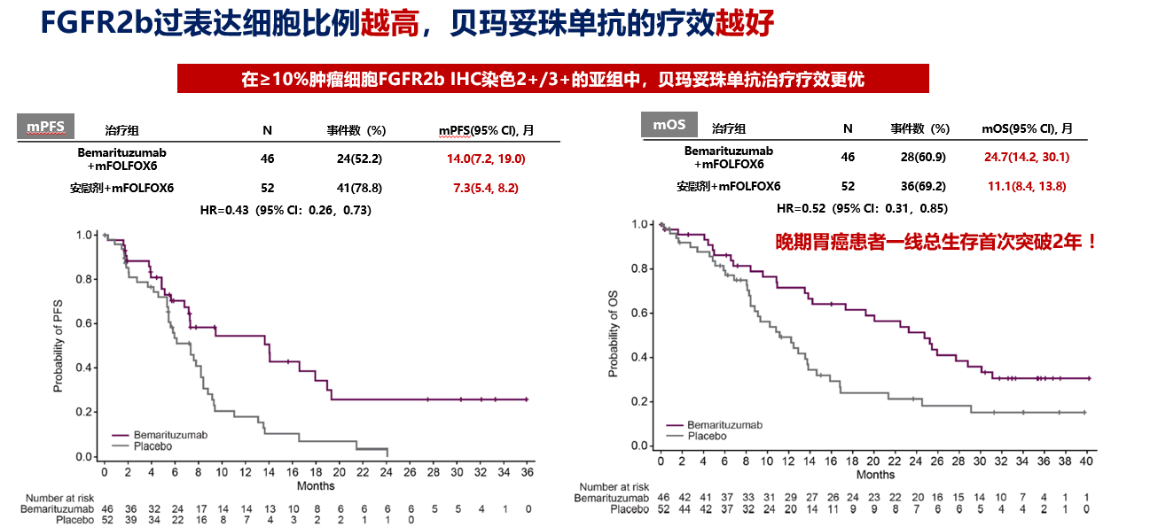 再鼎医药此前披露的贝玛妥珠单抗2期FIGHT研究显示,贝玛妥珠单抗联合化疗可显著延长FGFR2b过表达胃癌患者生存,也是首个实现晚期胃癌患者一线总生存突破2年的临床研究。此外FIGHT研究还显示,患者的FGFR2b过表达细胞比例越高,疗效越好,在≥10%肿瘤细胞FGFR2b IHC染色2+/3+的亚组中,贝玛妥珠单抗治疗疗效更优。