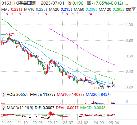 当日,英皇国际股价盘中大跌近16%至0.2港元,创下自5月初以来的新低。截至7月4日,英皇国际股价已连续5日下跌,最后收盘报0.196港元,总市值约10.81亿港元。