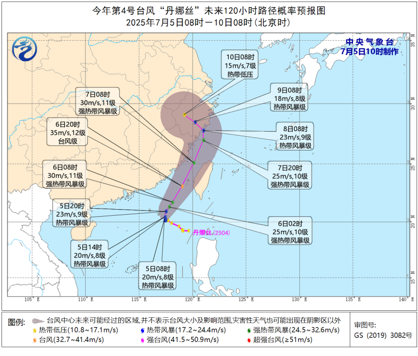 预计,“丹娜丝”将先回旋少动,之后逐渐转向北偏东方向移动,强度逐渐增强,最强可达台风级;穿过台湾海峡之后,可能于7日夜间至8日上午在福建北部至浙江沿海登陆。