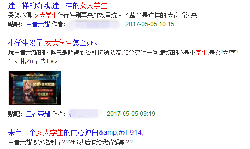 2017年4月17日,《王者荣耀》运营团队发出公告,要求玩家对QQ号进行实名认证,接入防沉迷系统,未满18岁的玩家每日只能玩两小时。这条消息发出后,在微博和贴吧上,很多玩家的反应是:现在最坑的难道不是女大学生么?