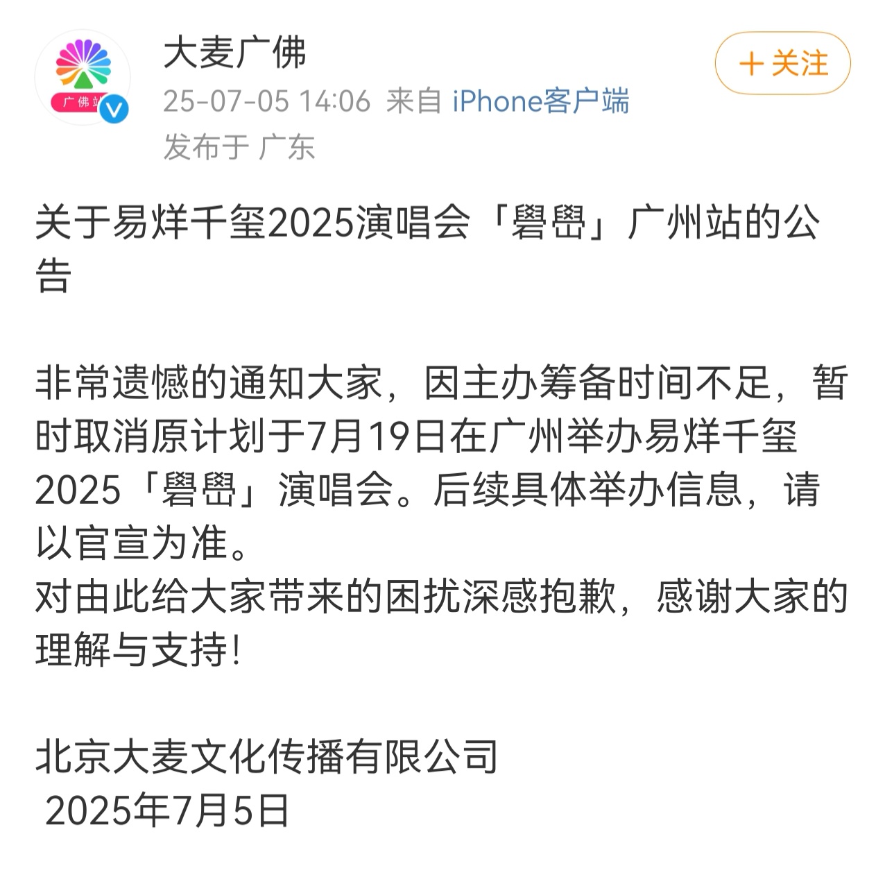 此事的起因是7月5日下午,北京大麦文化传播有限公司通过大麦广佛官方微博发布公告称,因主办筹备时间不足,暂时取消原计划于7月19日在广州举办易烊千玺2025“礐嶨”演唱会。
