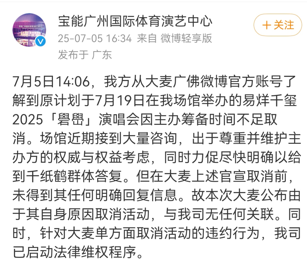随后,宝能广州国际体育演艺中心发文称,“在大麦上述官宣取消前,未得到其任何明确回复信息。故本次大麦公布由于其自身原因取消活动,与我司无任何关联。同时,针对大麦单方面取消活动的违约行为,我司已启动法律维权程序。”
