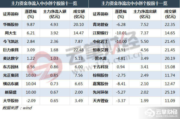 中小创板块方面:今日主力资金共净流出105.87亿元。其中中小创主力资金净流入靠前的个股有:华斯股份,周大生,今飞凯达,分别净流入4.93亿元,3.92亿元,2.36亿元;主力资金净流出靠前的有青龙管业、江阴银行,中化岩土,分别净流出7.52亿元,7.37亿元,5.5亿元。