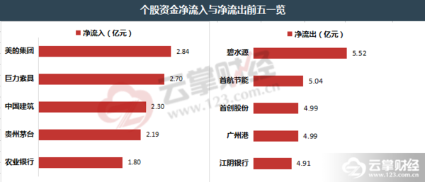 个股方面:美的集团今日净吸金2.84亿元排在首位,巨力索具和中国建筑分别以2.7亿元和2.3亿元的资金净流入量排在第二及第三。