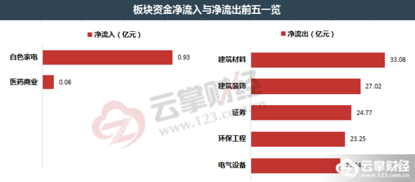 板块方面:今日仅两板块有资金净流入。白色家电以0.93亿元的净流入排在第一,其次是医药商业以0.08亿元排在资金进流入的第二。而建筑材料今日以33.08亿元的净流出排在资金出逃榜首。建筑装饰和证券分别以27.02亿元和24.77亿元的净流出量排在第二和第三。