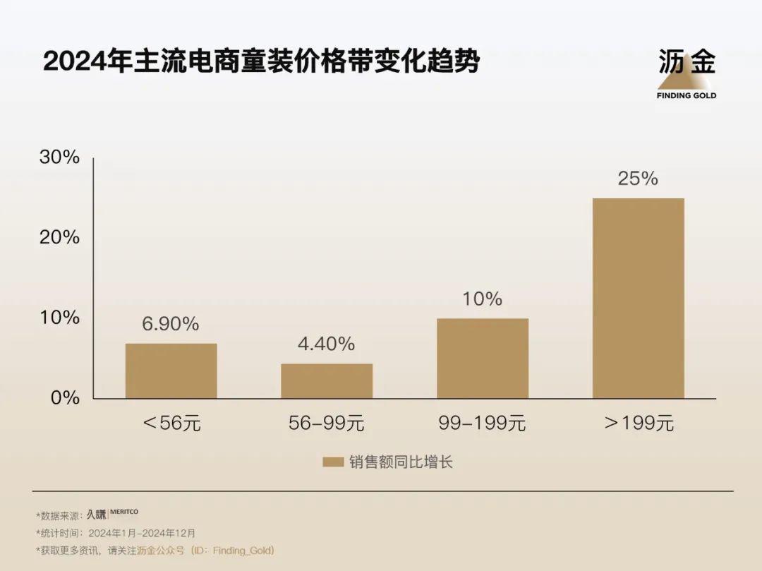 反观国内童装赛道,生育率虽然下滑,但家长们的消费意愿却更强了。从价格带占比变化来看,童装品类的客单价正在提升。