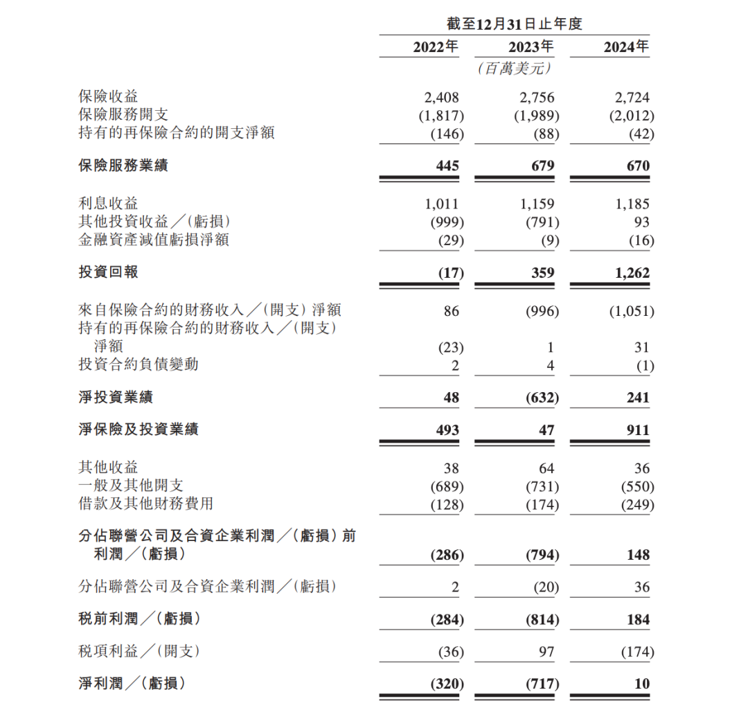财务方面,于2022年度、2023年度以及2024年度,富卫集团分别实现保险收益24.08亿美元、27.56亿美元、27.24亿美元;保险业务业绩分别为4.45亿美元、6.79亿美元、6.70亿美元;投资回报分别为-0.17亿美元、3.59亿美元、12.62亿美元;净利润分别为-3.20亿美元、-7.17亿美元和0.1亿美元,公司2024年实现扭亏为盈。