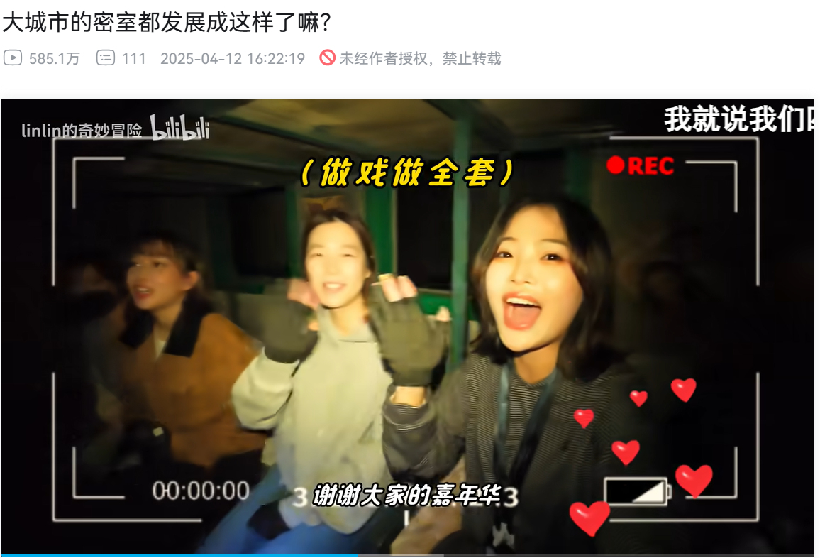 比如B站拥有31.8万粉丝的UP主“linlin的奇妙冒险”,原本多数内容为vlog作品,如今转而发布了多个密室逃脱第一视角体验视频,其2025年4月发布的一期密室视频播放量达585.1万。