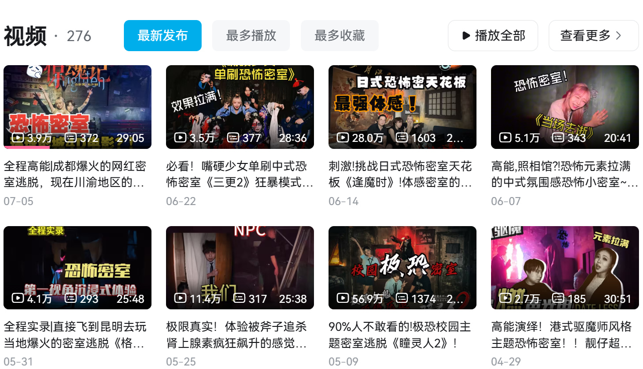 抖音、快手等平台高频出现玩家受惊吓、与NPC互动的短视频,形成了天然话题裂变。许多恐怖密室都会特意将玩家被追逐、受惊吓的监控视频提供给玩家或发布至视频平台。还有众多博主体验、测评密室也能吸引用户眼球——密室逃脱凭借场景转换、机关触发与NPC追逐等强感官冲击,更易产出高传播度的视频。