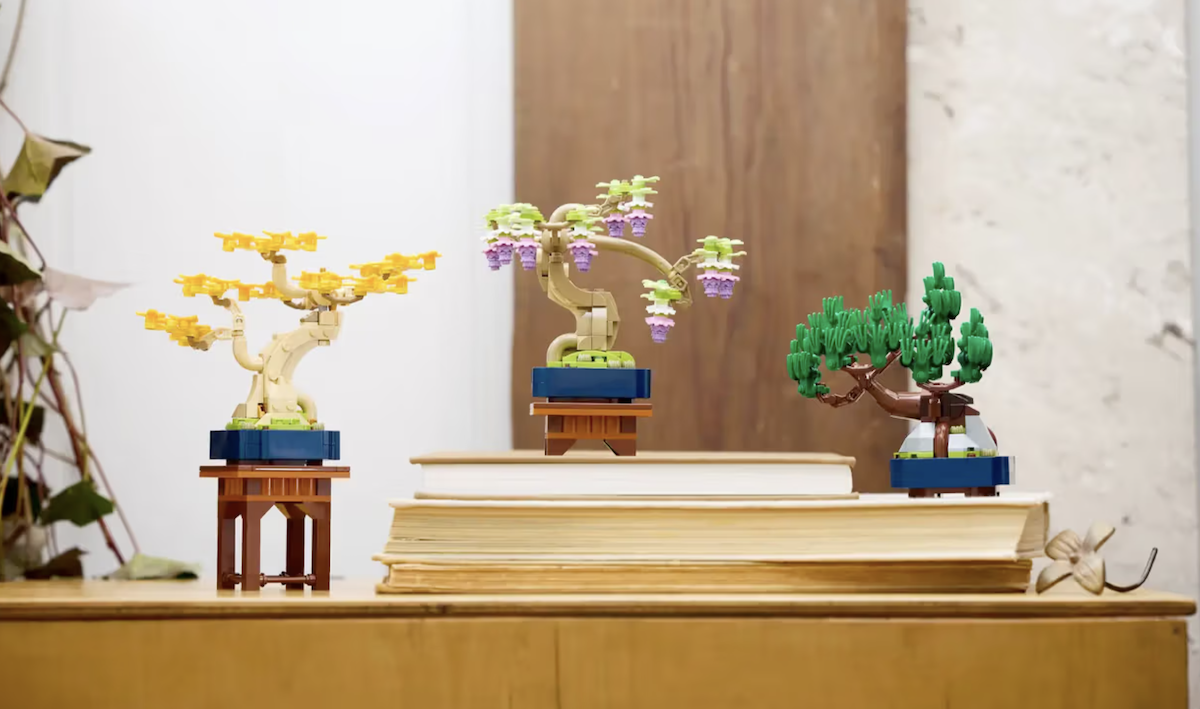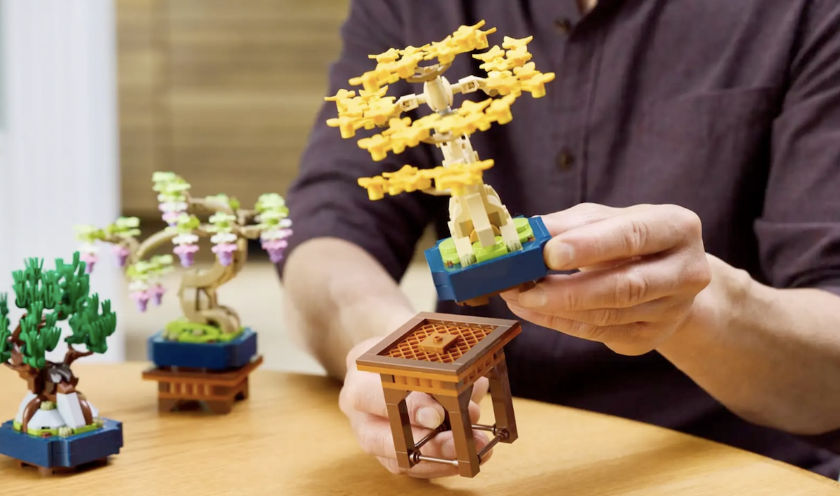 最新的三款盆栽积木以银杏树、紫藤树和黑松树为灵感。银杏树是秋天的模样,叶子已经变成了金黄色。紫藤树则对应了春日时节,翠绿的叶子下是清新淡然的紫色花朵。黑松树依然挺立,翠绿色针叶的还原度极高。