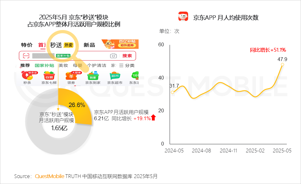 QuestMobile数据显示,截止2025年5月,京东“秒送”模块月活跃用户规模已达1.65亿,占京东APP整体流量的26.6%,京东APP用户月人均使用次数已达47.9次,同比提升51.1%。