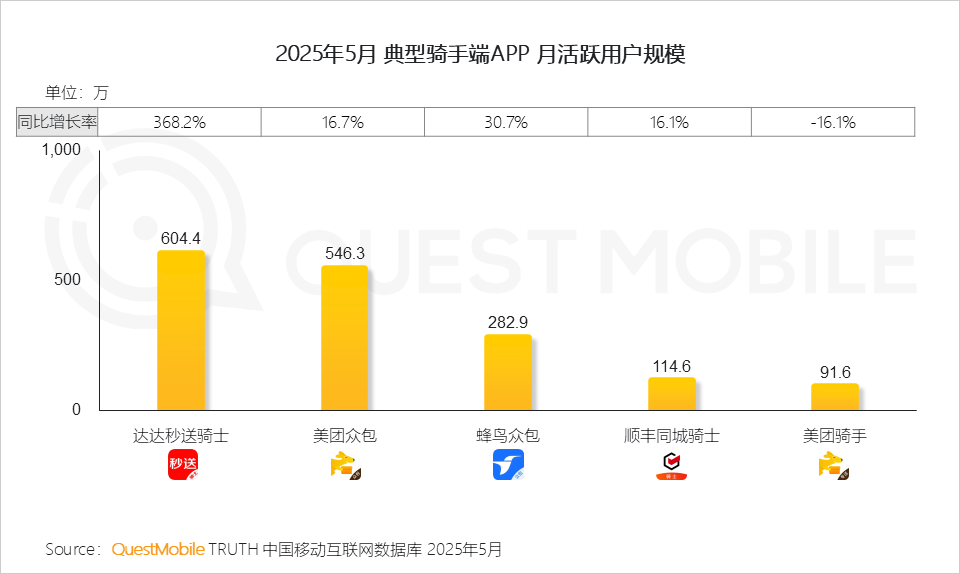 QuestMobile数据显示,截止2025年5月,京东旗下的达达秒送骑士APP月活跃用户规模超600万,同比提升368%,领跑骑手端应用市场,美团众包、蜂鸟众包APP月活跃用户规模分别达到546.3万和282.9万,增速也均实现两位数增长,分别为16.7%、30.7%。
