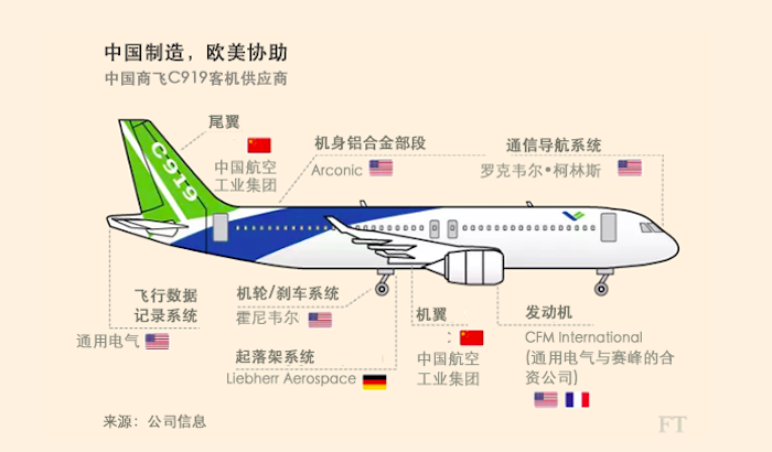 C919是商飞公司按照国际标准研发、制造的大型喷气式民用飞机,最多可以乘坐190人(C919得名的原因之一),但是这不意味着飞机所有的零部件(超过100万个)都是在中国生产,相反,飞机发动机、机载设备、以及材料都是外包给其他企业生产,比如发动机是由美国通用电气公司(GE)和法国赛峰集团(Safran)合作研发生产的。