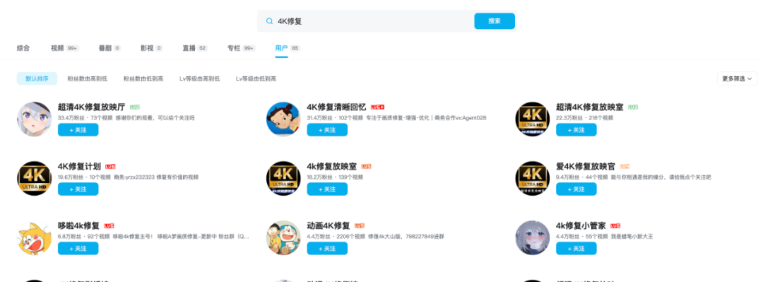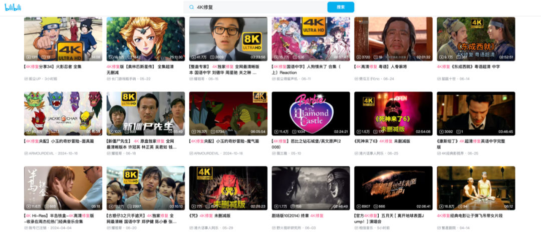 在B站搜索“4K修复”的结果页面,图/哔哩哔哩官网