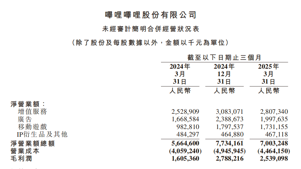 B站2025年一季度主营业务收入,图/B站2025年一季度财报