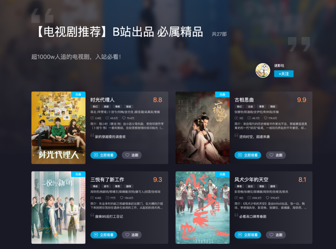 2019年至今,B站出品剧共27部,年均出品剧数量不足4部,其中较有名气的只有《风犬少年的天空》《三悦有了新工作》《古相思曲》等少数几部作品。