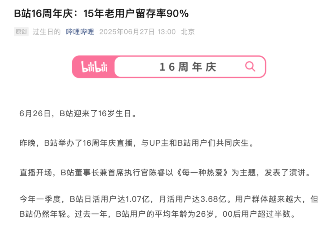 6月26日,B站16周年庆典上,B站董事长兼CEO陈睿分享出一份用户数据——今年一季度,B站日活用户达1.07亿,月活用户3.68亿,用户平均年龄26岁。