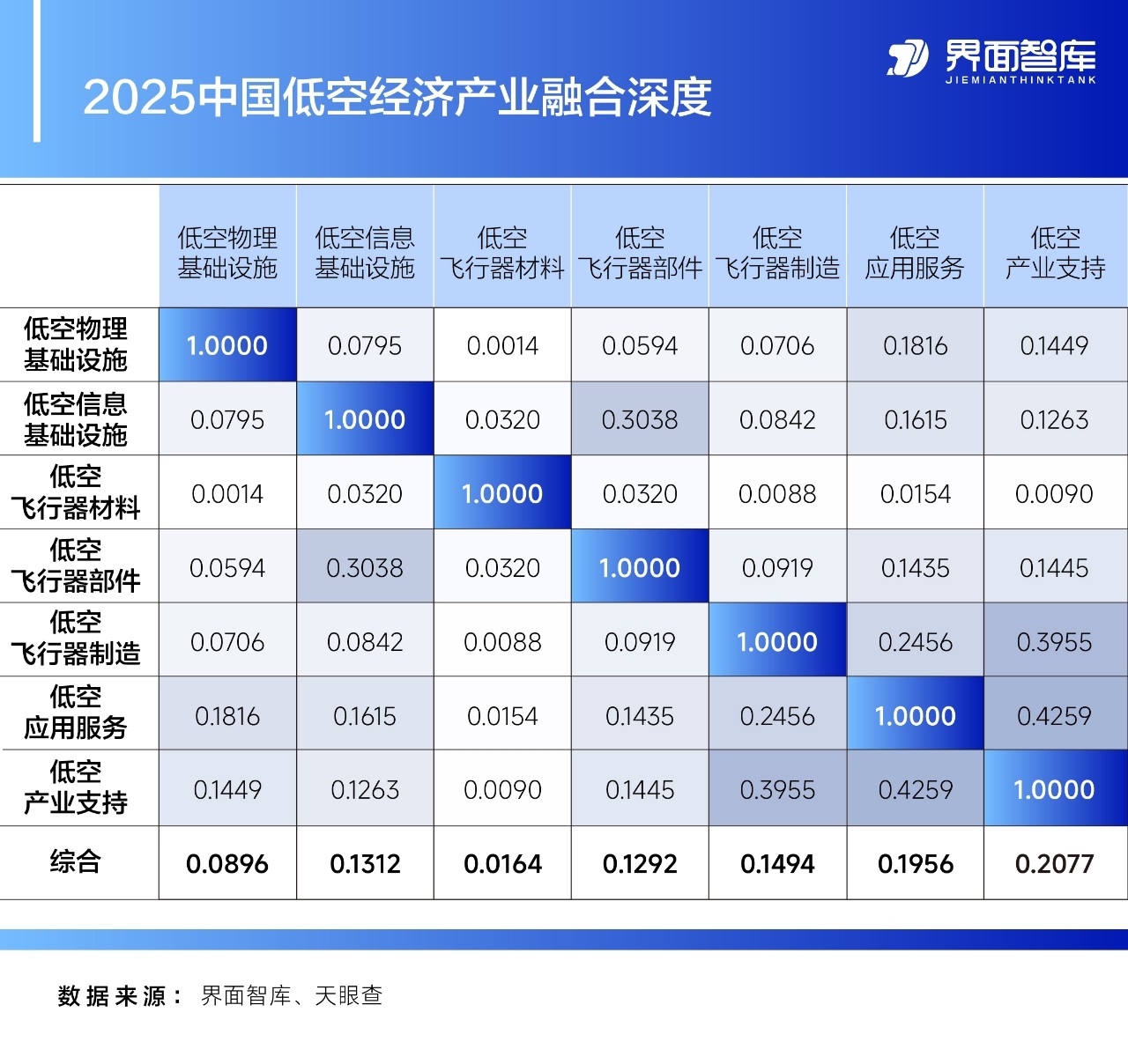 为全面评估低空经济产业的融合情况,界面智库构建了两个融合度指标:产业融合广度与产业融合深度。