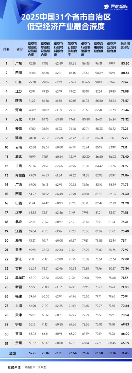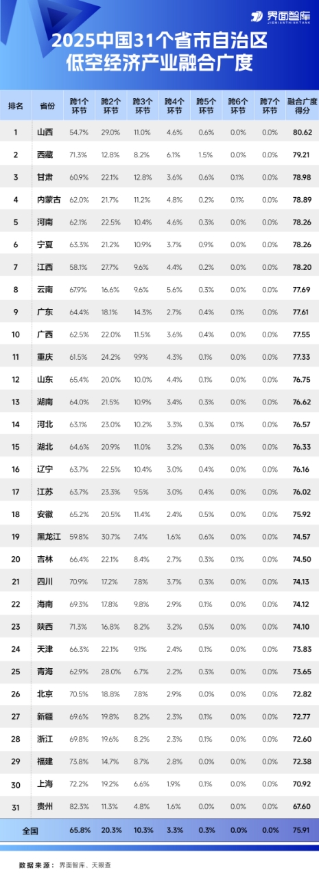 【编者按】 在“因地制宜发展新质生产力”的政策背景下,2025年界面智库将启动“新质生产力产业地图”系列研究。该研究聚焦新质生产力相关产业,横向比对各地产业布局、政策规划、治理体系及发展现状,全景解析各地新质生产力产业链,为地方政府产业政策制定及企业、投资者决策提供参考。“低空经济”将作为系列研究首期主题,继“全景篇”后,界面智库将陆续发布《中国低空经济产业链研究报告》“产业篇”,本文将评估中国31个省市自治区的低空经济产业融合度。
