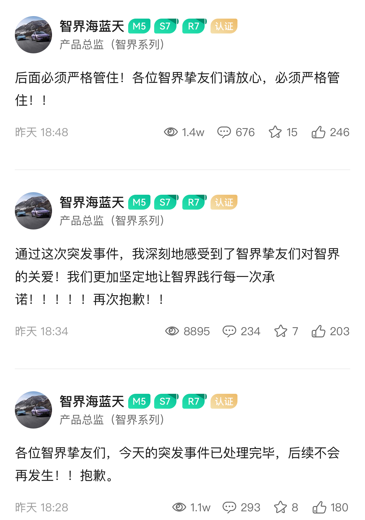 7月8日晚间,针对智界官方视频号直播宣传奇瑞风云A9L上市,鸿蒙智行智界系列产品总监海蓝天发文道歉,称突发事件已处理完毕,后续不会再发生。据了解,智界是鸿蒙智行旗下发布的第二个品牌,由华为与奇瑞合作推出。