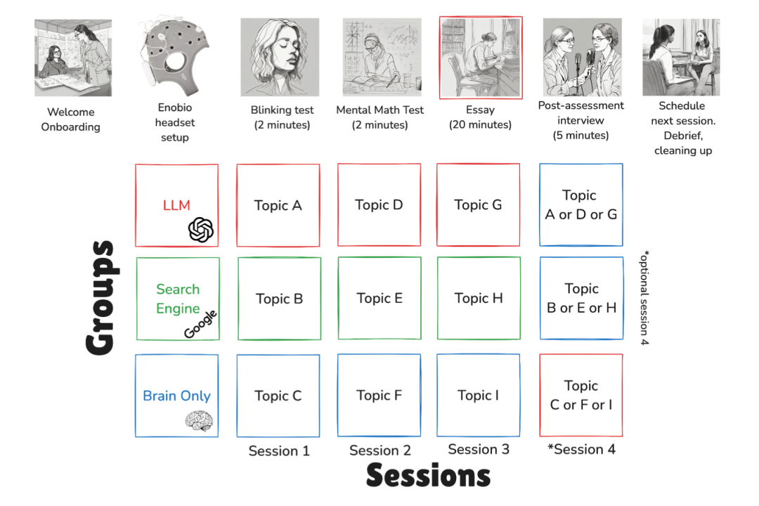 这项研究将54名受试者分为三组进行写作测试:纯人工组仅靠自身知识、搜索引擎组可使用Google、AI辅助组可以使用ChatGPT。
