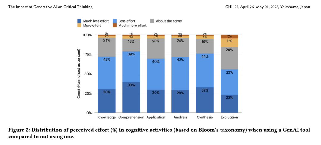 2025年2月,一份来自微软研究院和卡内基梅隆大学的研究《The Impact of Generative AI on Critical Thinking: Self-Reported Reductions in Cognitive Effort and Confidence Effects From a Survey of Knowledge Workers》,通过对319名知识工作者的调查发现,当用户对自身在该领域的专业能力有信心时,使用AI反而会激发更多的批判性思维。