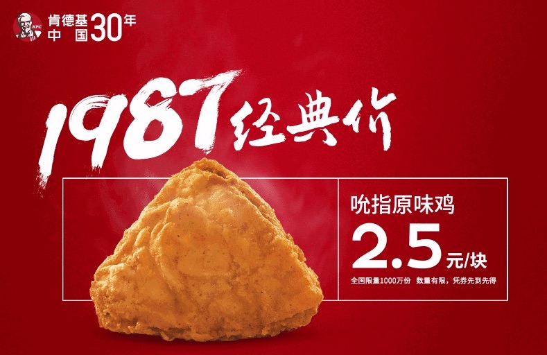 在各种关于房价和物价的讨论之中,让某种产品的价格在经济实力不变的情况下,回归到30年前,怎么听都是一种让人兴奋的想法。肯德基正巧是利用了这样的心理,在这两款经典产品之中实现了消费者的这种幻想,而且限时限量,并不会对它的利润产生太大影响,同时还可以带来一定的传播效果和品牌好感。