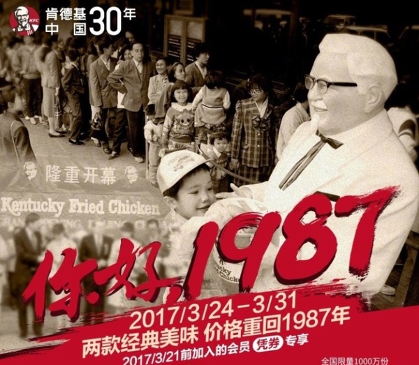 2017年时肯德基进入中国30周年,除了一些品牌宣传层面的活动之外,肯德基与消费者的互动主要通过经典产品为媒介,通过“怀旧”或者“情怀”的方式来进行沟通。嫩牛五方回归前,肯德基还把吮指原味鸡和土豆泥的价格降至1987年初上市时的的市价,不过也只是在特定日期内出售,限量600万份。