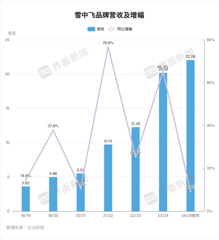 但增势在过去一年放缓,24/25财年,雪中飞营收同比增长9.2%至22.06亿元,远低于上一财年65.3%的增速。