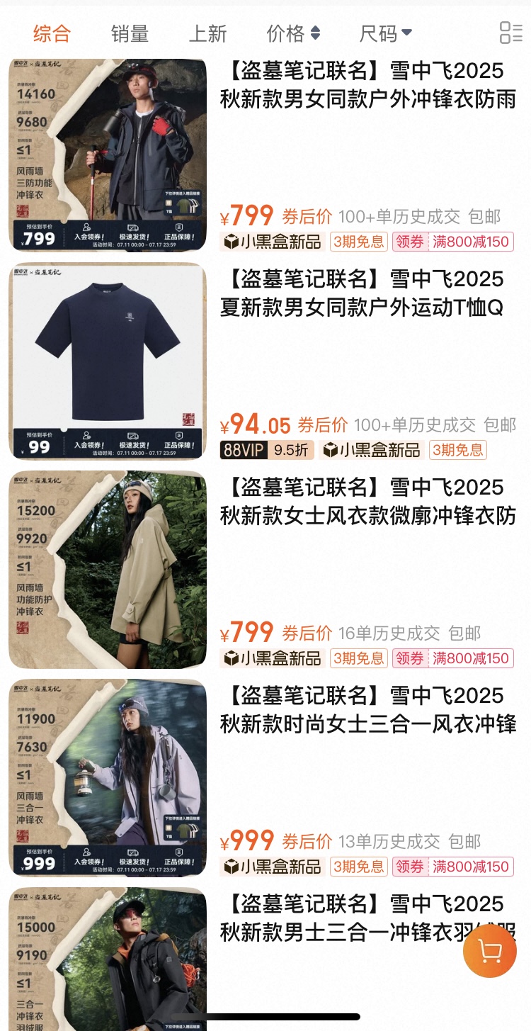 界面新闻留意到,该联名系列发售约36小时后,其中一款799元冲锋衣和99元T恤在雪中飞天猫旗舰店内销量破百,其他款式销量还未超过20件。