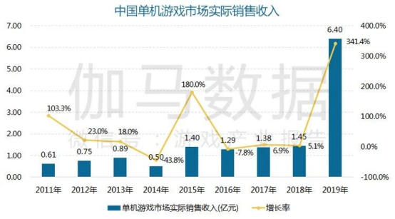 在几年前,相较于风头正盛的移动游戏市场,国产单机市场甚至可以忽略不计。根据伽马数据发布的《2019中国游戏产业年度报告》,2019年中国单机游戏市场实际销售收入大幅上涨,同比增长341.1%。那么实际销售收入是多少呢?6.4亿元。