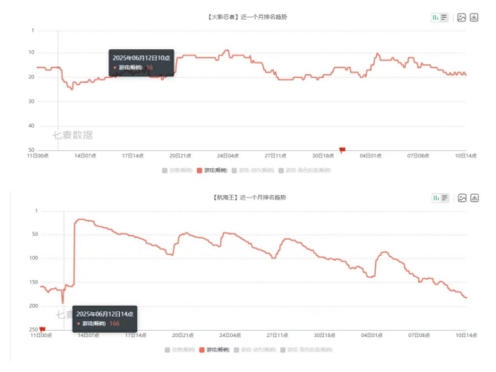 魔方工作室的《航海王:壮志雄心》就是个很好的例子,相较于前辈《火影忍者手游》,从画面和商业模式来说,无疑有了不小的品质提升。但由于玩法与《火影忍者手游》类似,游戏体验趋于同质化,目前并没有成功接棒。根据七麦数据近一个月的畅销榜排名对比,《火影忍者》平均排名要更高。