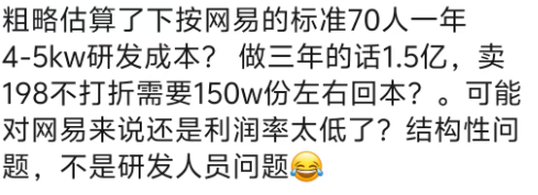 被砍掉的《万民长歌:三国》就是一个例子,据从业人员按照网易平均用工成本估算,70人规模的团队三年的用工成本在1.5亿左右。售价198元的话需要接近150万份回本。而目标竞品《三国志14》和《三国志14:威力加强版》在21年9月官方宣布出货量突破50万套,并且单机买断制游戏在发售初期获取绝大部分销量,长尾效应爆炸可能也只有75万套,距离150万套不到一半。