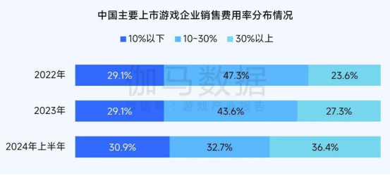 另一方面则是买量成本的升高。根据《2024中国移动游戏广告营销报告》,2024年上半年,中国主要上市游戏企业销售费用率均值再次上升,销售费用率超过30%的企业数量也有所增加,说明现阶段大幅投入营销仍是企业重要的获量途径。